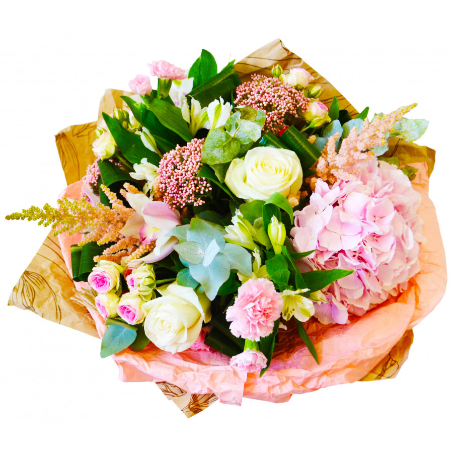 Восхитительно нежный букет из сочетания эквадорских и кустовых роз с величественными орхидеями, пышным облаком розовой гортензии и экзотической астильбой станет достойным подарком для самой изысканной и предвзятой натуры - первой красавицы Парижа!