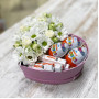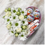 На фото композиция с цветами и киндерами в коробке. В составе: хризантема кустовая 2 шт, кустовая роза 1 шт, киндер-сюрприз 3 шт, киндер шоколад 1 шт, коробка (s) 1 шт, . Все цветы свежие и ароматные, букет красиво оформлен и отлично подходит для подарка. Доступна доставка цветов или самовывоз.