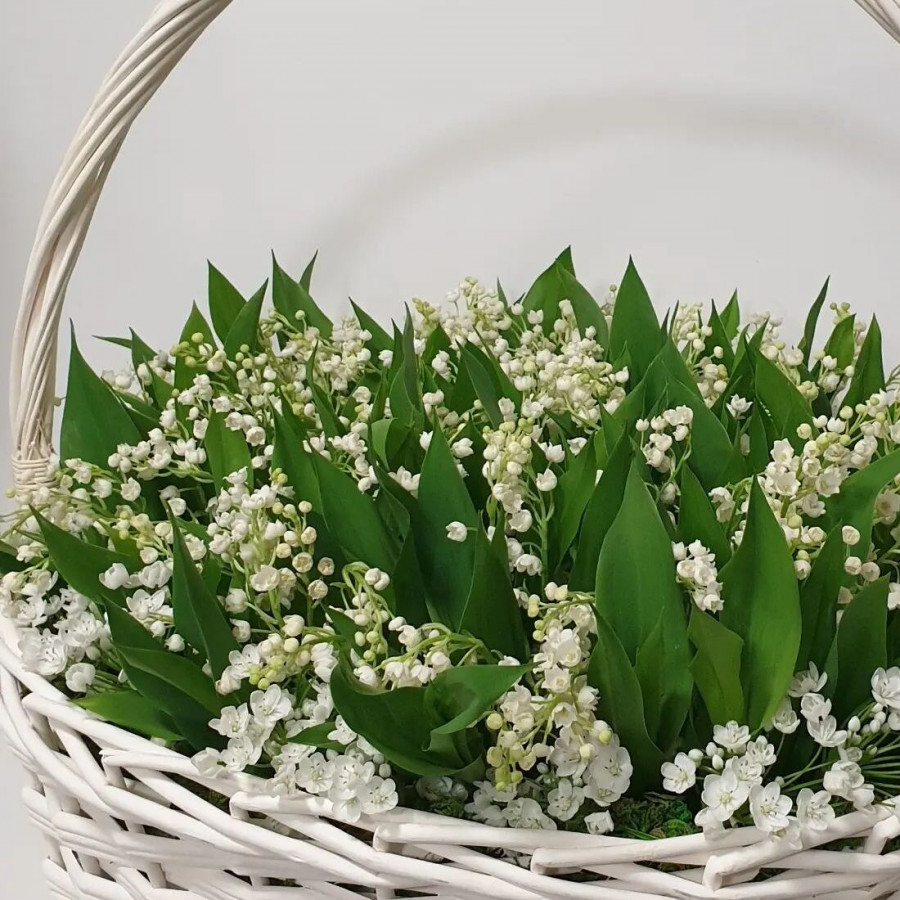 На фото корзина с ландышами. В составе: ландыш 27 шт, корзина (l) 1 шт, атласная лента 1 шт, . Все цветы свежие и ароматные, букет красиво оформлен и отлично подходит для подарка. Доступна доставка цветов или самовывоз.