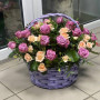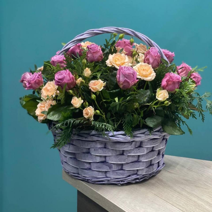 На фото кустовые розы в корзине. В составе: роза 25 шт, кустовая роза 11 шт, писташ 2 шт, туя 2 шт, . Все цветы свежие и ароматные, букет красиво оформлен и отлично подходит для подарка. Доступна доставка цветов или самовывоз.